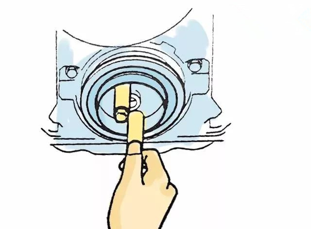 在油封壓力機(jī)的導(dǎo)管內(nèi)插入新的后油封。在此需注意油封的方向,毛氈面應(yīng)在飛輪罩一側(cè)。后續(xù)安裝步驟與前油封的一致。